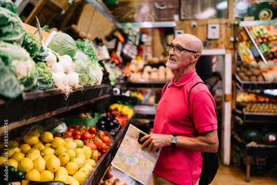 Mature Caucasian senior in optical eyewear for vision correction holding orientation location map in hand and looking for fresh vitamins during shopping, aged gourmet enjoying healthy lifestyle