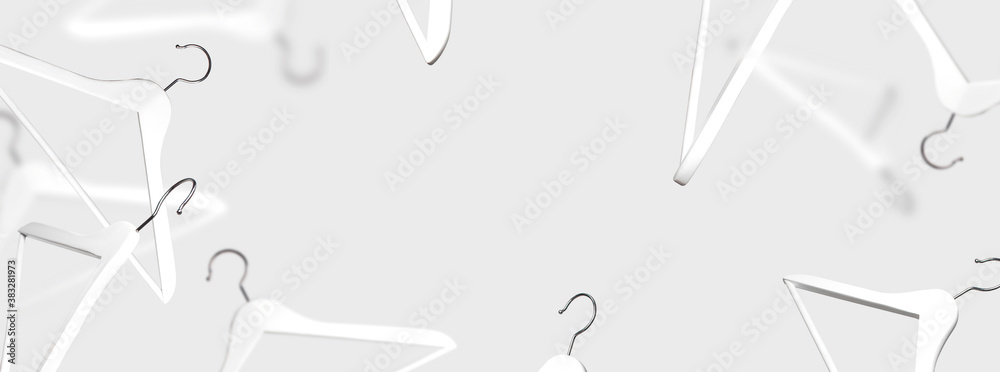 Flying white wooden empty clothes hangers on gray background. Creative fashion background, garment storage accessory. Fashion, style, concept of sales and discounts in stores. Minimalistic style