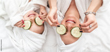 Positive mother and daughter doing face mask applying pieces of cucumber to their eyes, wrapped in a white bath towel, Facial skin care, cosmetology and spa