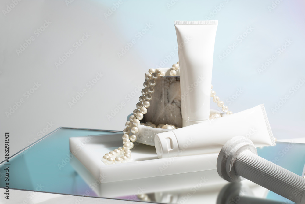 beauty treatment medical skincare cosmetic lotion cream serum mockup bottle packaging product on white decor background in healthcare pharmaceutical medicine