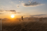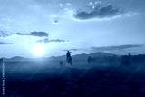 Wild horses run in foggy at sunset. Between Cappadocia and Kayseri, Turkey