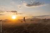 Wild horses run in foggy at sunset. Between Cappadocia and Kayseri, Turkey