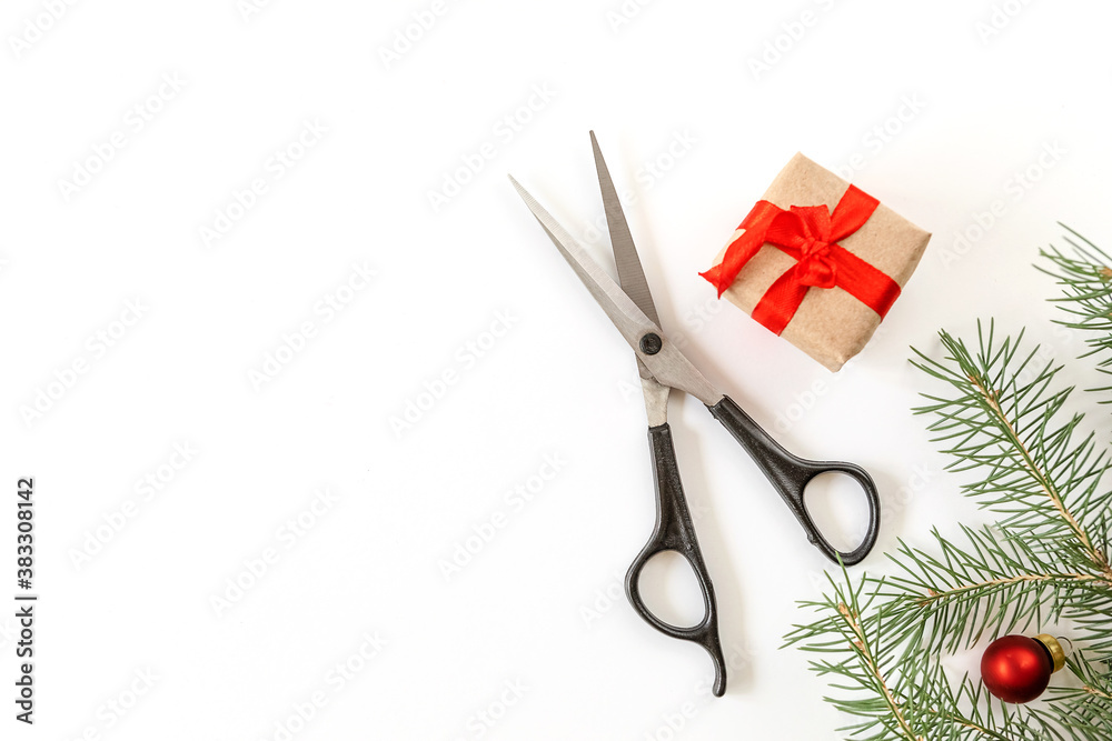 Christmas composition. Hairdressing scissors and a spruce branch on a white background. Template for a postcard or information about a hair salon. Flat lay, copy space.