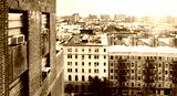 Harlem neighborhood cityscape at sunset, color toning applied, New York City, USA.