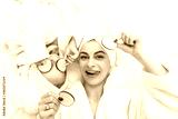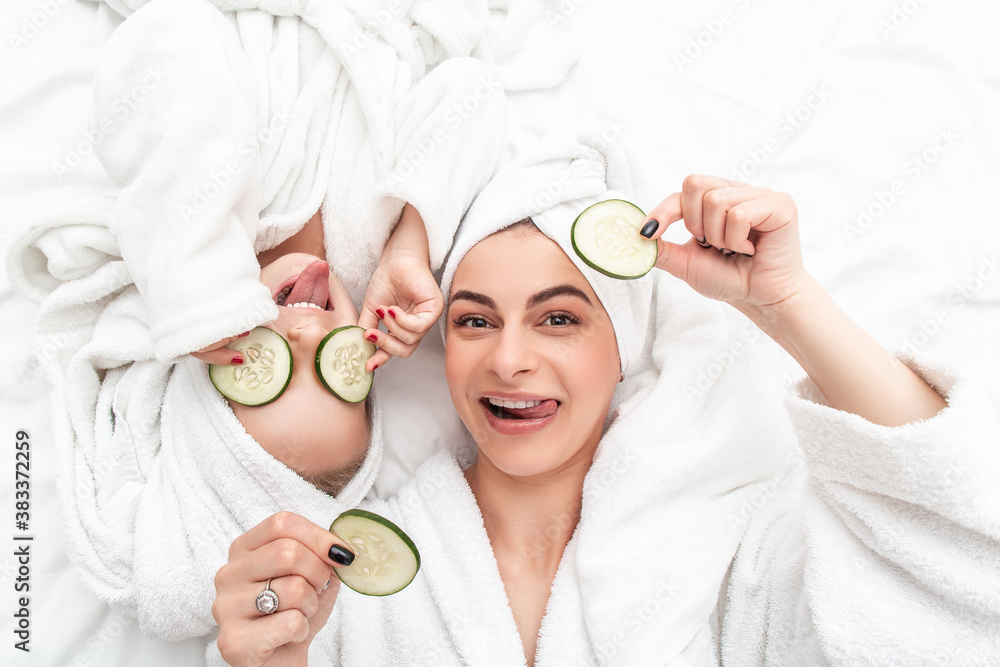 Positive mother and daughter doing face mask applying pieces of cucumber to their eyes, wrapped in a white bath towel, beauty procedures at home. Facial skin care, cosmetology and spa