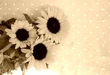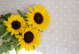 Beautiful yellow sunflowers on a delicate beige textile flat lay layout with copy space, rustic style composition.