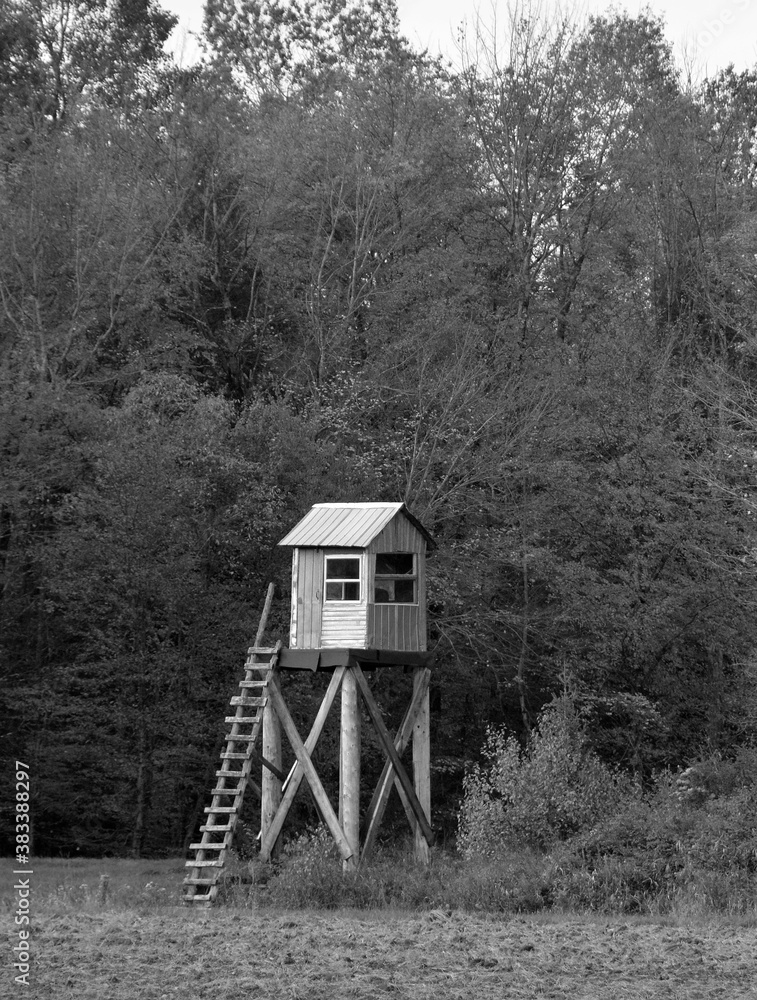 Hunting tower in nature, eastern township. Lookout tower for hunting in fall day.