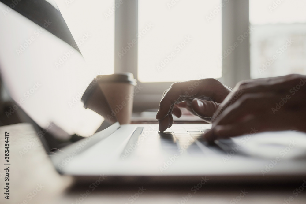 Male hands typing on computer keyboard closeup, business man or student using laptop at home, online learning, internet marketing, working from home, office workplace, freelance concept