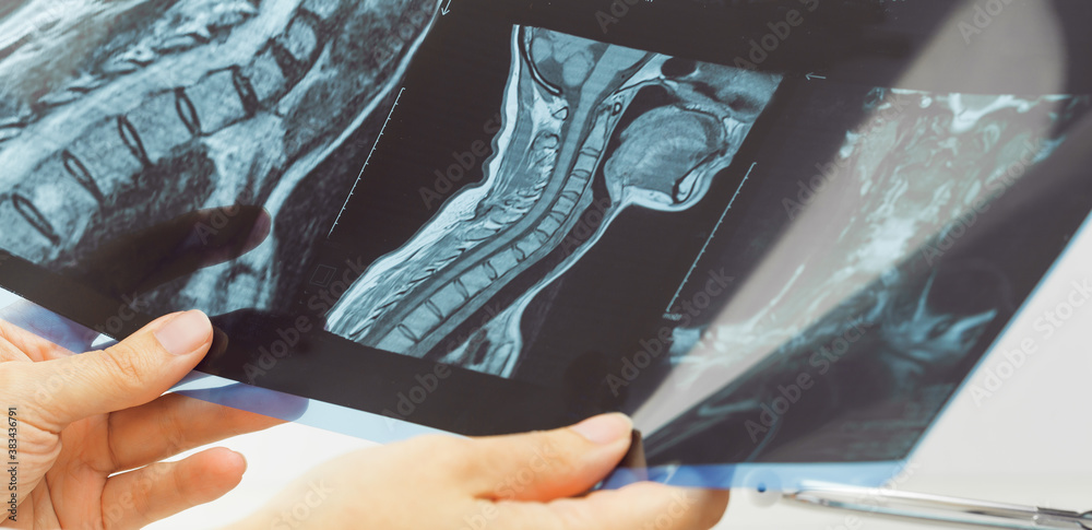 doctors hands holding x-ray or MRI medical imaging with a head and neck condition. Spinal cord, blood vessels. Neuro medicine. Healthcare and medicine. Injury. Bone tissues. Banner