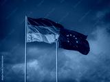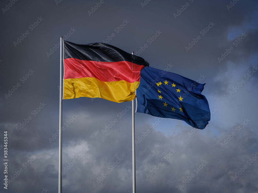 EU and Germany waving flags with grey cloudy dramatic sky on background