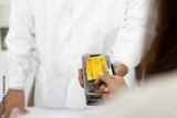 Customer making payment using credit card contactless with a credit card reader machine in modern pharmacy. NFC technology