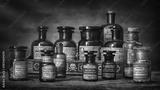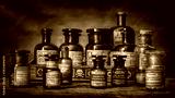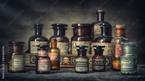 Bottles with drugs from old medical, chemical and pharmaceutical glass. Chemistry and pharmacy history concept background. Retro style. Chemical substances-sulfamerazin, arsenic trioxid etc.