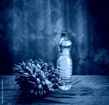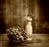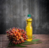 Fresh palm oil fruits and cooking palm oil on a palm leaves in wooden background