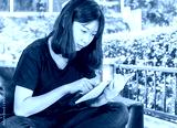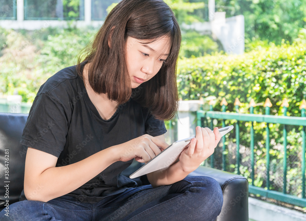 Young girl studying online from digital tablet in parlor