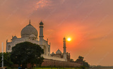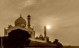The Taj Mahal , ivory-white marble mausoleum at the time of Sunset on the south bank of the Yamuna river in the Indian city of Agra.