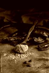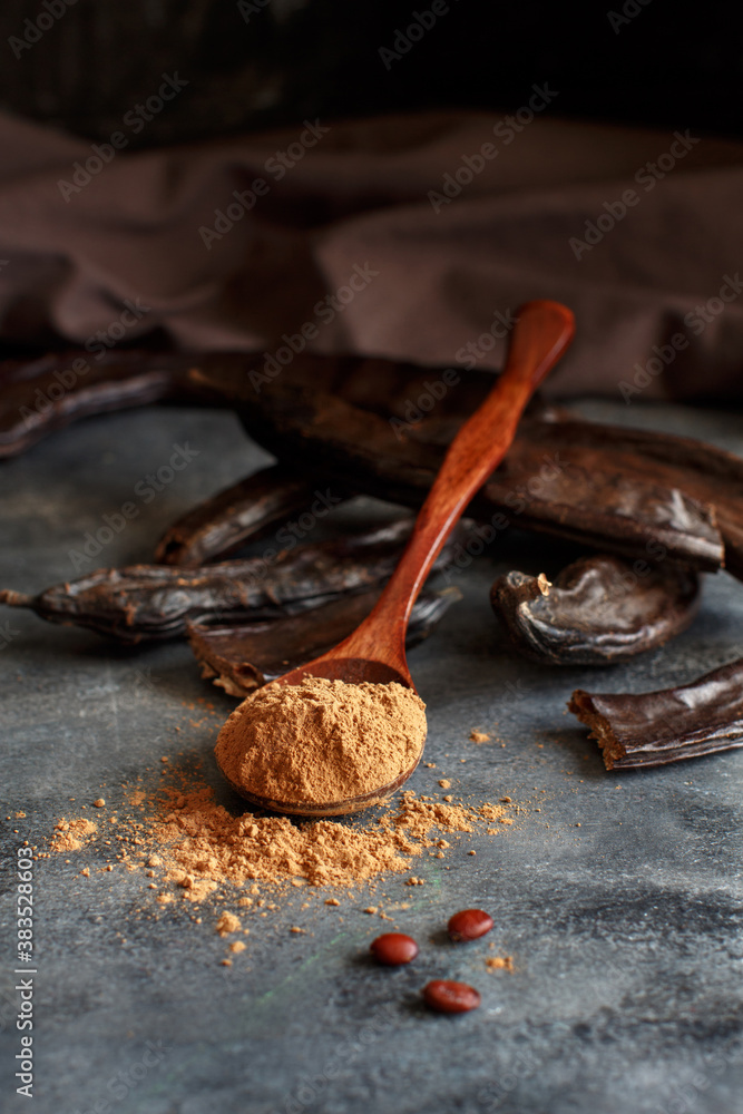 Spoon of carob pods close up