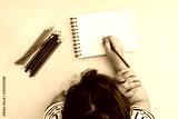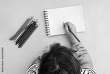 Little girl hand drawing, blank notebook and colored pencils on blue background