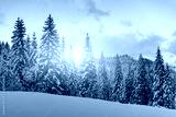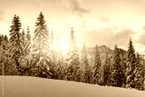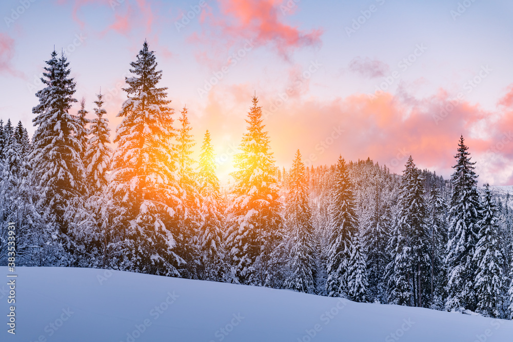 Fantastic orange winter landscape in snowy mountains glowing by sunlight. Dramatic wintry scene with snowy trees. Christmas holiday background