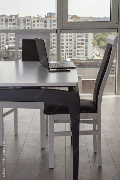 Modern kitchen interior in an apartment in a high-rise building, large Windows from floor to ceiling, kitchen-Studio.