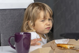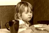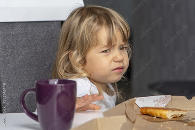 The little girl doesn't want to eat pizza. Concept: children's whims at the table, not the desire to eat.