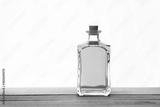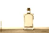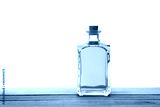 A blue alcoholic drink. Blue cocktail in a glass vintage bottle on wooden table. Wooden cork. White background. Space for text.