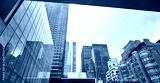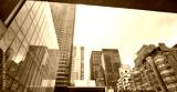 Black and white picture of New York City diverse architecture on a cloudy day, USA.