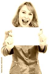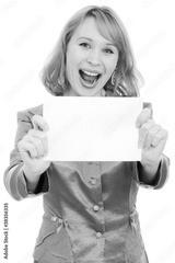 Happy woman showing blank signboard, isolated