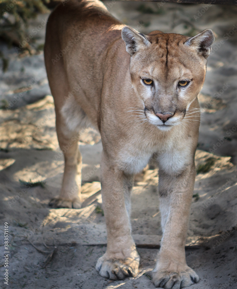 Young Florida Panther standing in forest waiting for prey