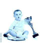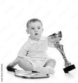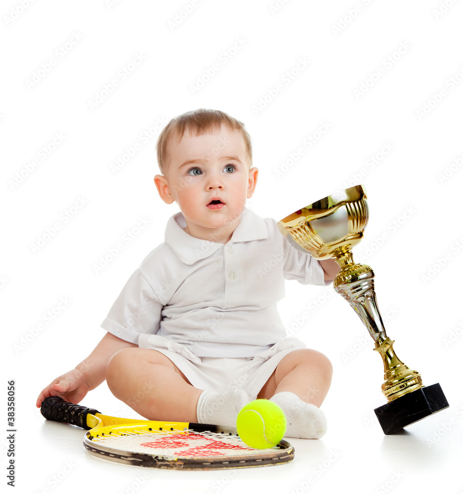 adorable child playing with tennis racket and cup over white bac