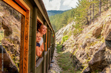Happy smiling mother with her daughter looking out from window while traveling together by train