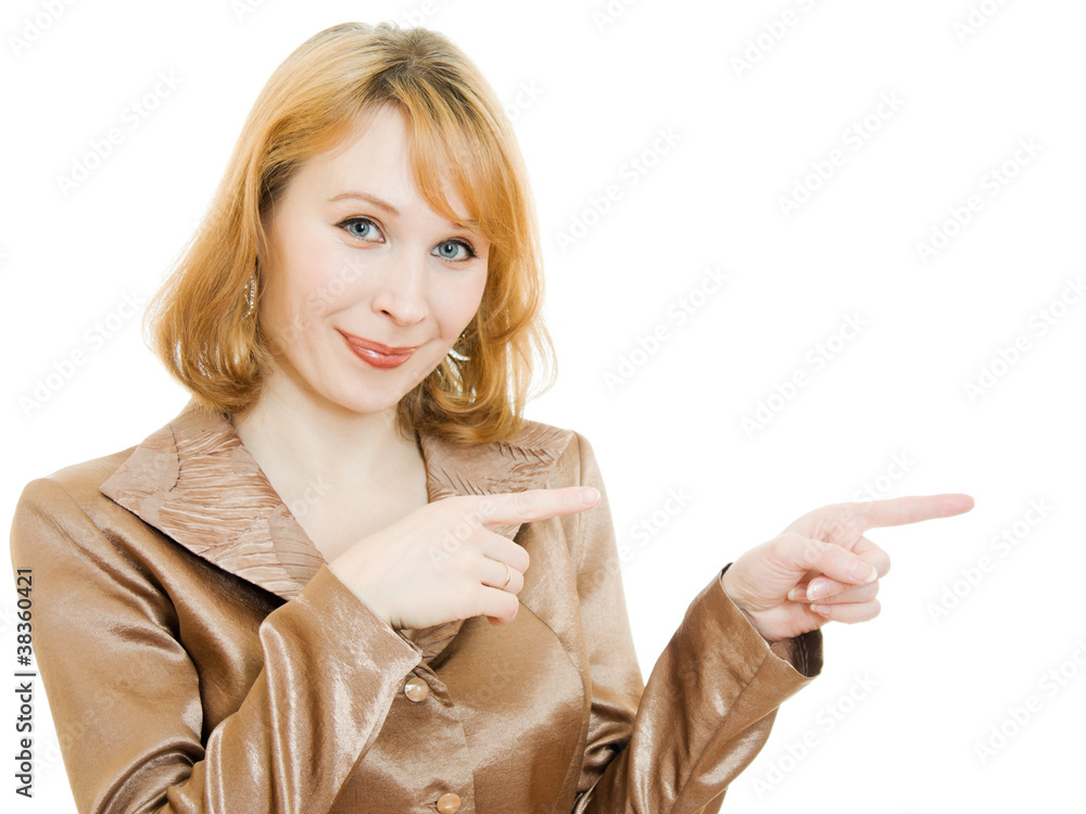 The woman points a finger in the direction