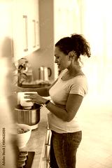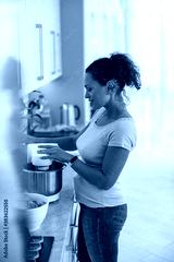 Beautiful smily handsome woman is preparing tasty fresh raw italian pasta at her kitchen at home