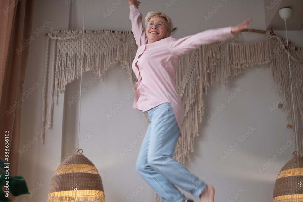 Mature carefree woman at morning jumping on the bed having fun