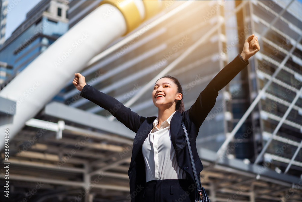 successful business woman with arms raised in city