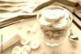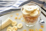 Greek yogurt, corn flakes cereal and sliced banana in a glass. Healthy breakfast. Dietary and weight loss control program. Copy space is on the left side on the blurry part of photo.