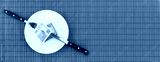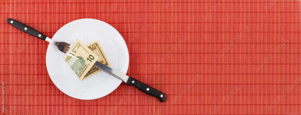 Money on plate with fork and knife. Business and financial concept.