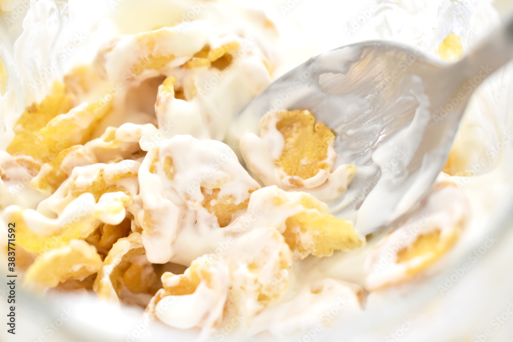 Greek yogurt with corn flakes cereal on a glass. Healthy breakfast. Dietary and weight loss food control program concept.