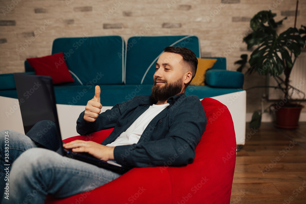Smiling bearded young man are using laptop, sitting in cozy red armchair at home. Happy male chatting in social network and shows the sign cool.
