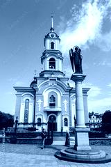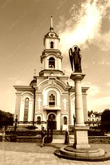 Statue of Saint Michael the Archangel near Orthodox Holy Transfiguration Cathedral in the center of Donetsk, Ukraine.