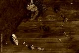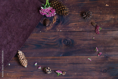 Terry soft brown bath towel, brown cones, pink flowers ochitok lie on a dark old table made of spruce boards, forming a frame with space for text inside.