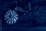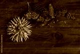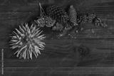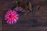 Brown wooden background with a composition of pink flowers of Dahlia and spruce, pine and fir cones. A dark background and copy space.