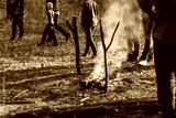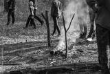 An extinct fire in the forest, strong thick smoke from the fire, people walk around the ashes.