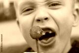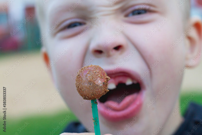 The round Lollipop is smeared with sand and earth. The boy wants to lick the dirty Lollipop with his tongue.