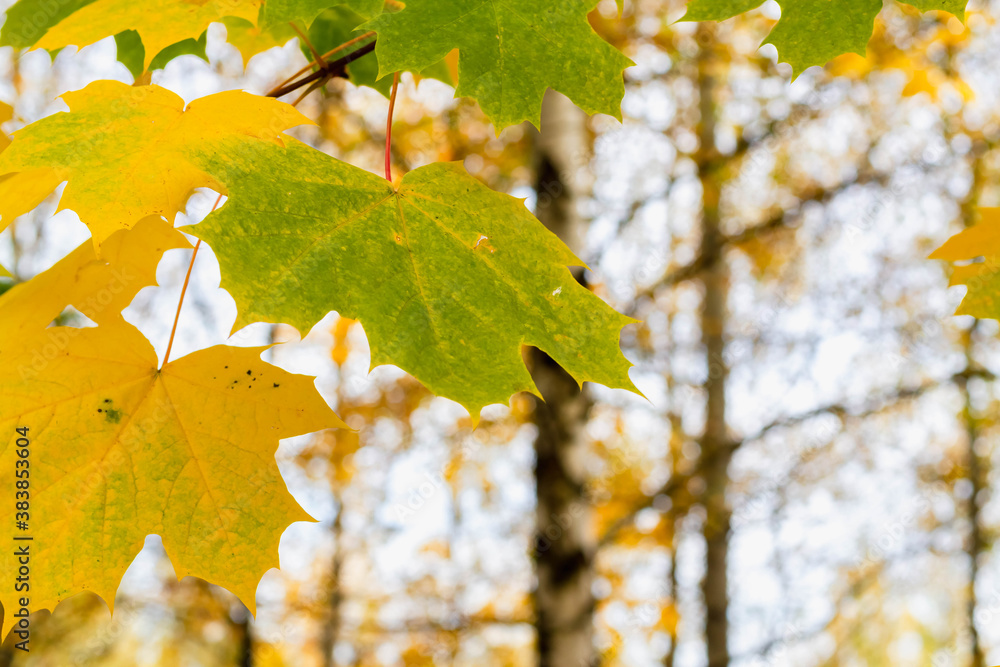 Bright juicy yellow and green maple leaves in autumn on maple trees in the Park. Beautiful bokeh in autumn, autumn landscape.