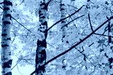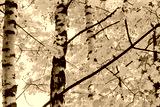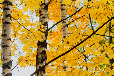 Bright juicy yellow maple leaves in autumn on maple trees. White and black birch trunks against the sky.