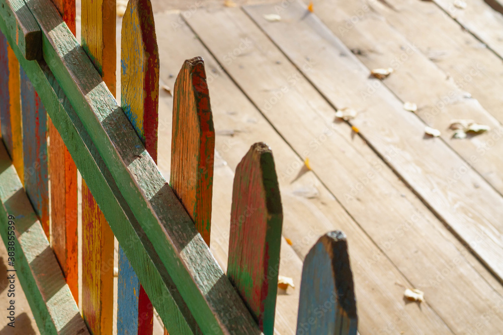 Wooden multicolored fence in the kindergarten on a wooden veranda for walking. Fallen leaves lie on the ground in autumn.