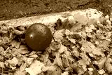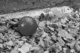 A child forgot a red rubber soccer ball on a pile of autumn fallen leaves. Autumn on the Playground in the city.