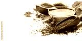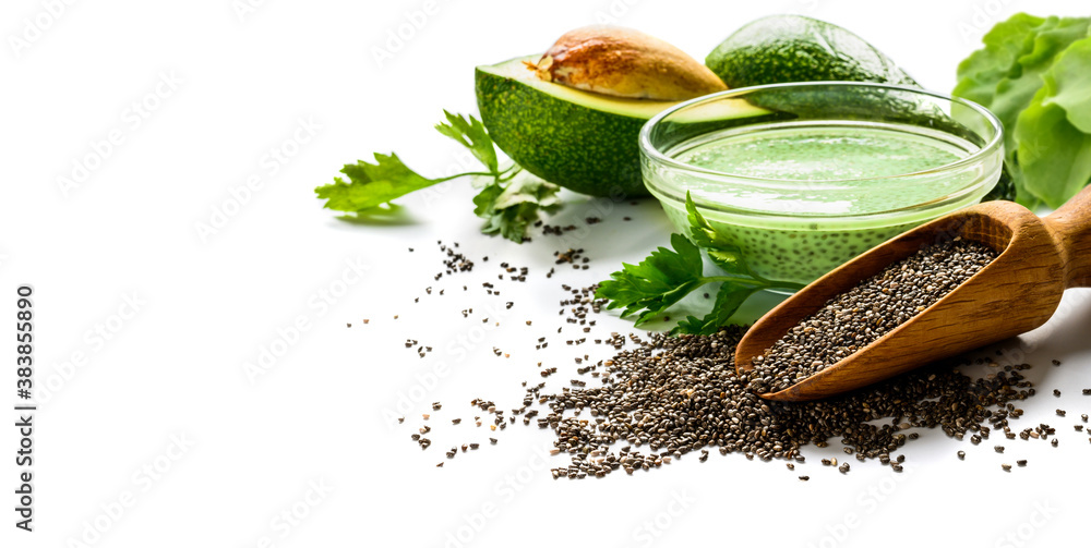 Chia seeds in wooden scoop with Green smoothie and avocado on white