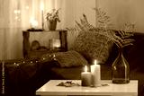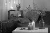 burning candles with autumn decor on white table at home