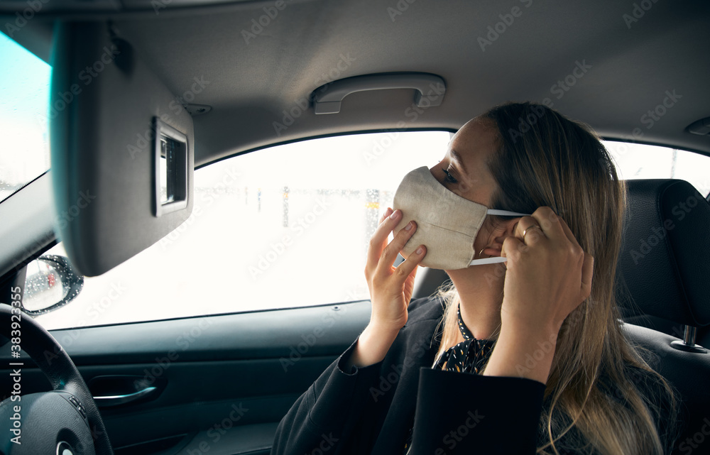 Young Businesswoman Putting On Face Mask In Car Before Going Into Work In Office